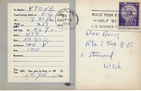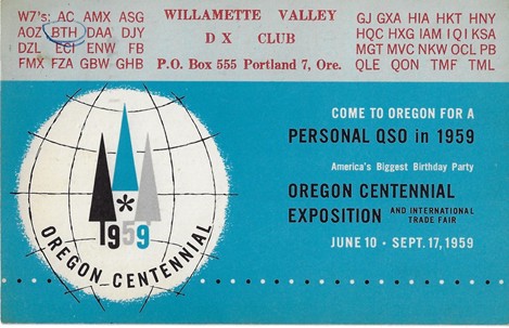 This was the year of the Oregon Centennial Exposition and International Trade Fair. The members of the WVDXC established a unique QSL card for 1959 contacts containing the callsign of each member. This is what it looked like.